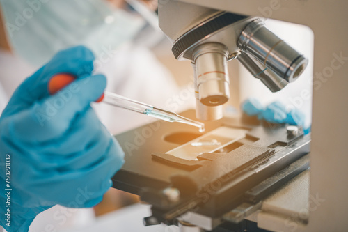 Female researchers are experimenting with pipette dropping a sample into a test tube in an experiment research in laboratory...