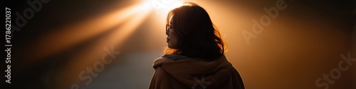 female, silhouette, light, ambience, mystical, asian, young, sunset, glow, backlit, mysterious, warmth, hoodie, goggles, serene, peaceful, atmosphere, shadow, solitude, contemplation, artistic, soft, gentle, gold, calmness, morning, dawn, evening, spotlight, scenery, background, beam, isolation, quiet, introspection, invisible, calm, serenity, vision, seeing, unknown, thought, imagination, aura
