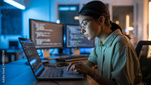 programming, coding, developer, programmer, engineer, information technology, information technology, technology, computer, laptop, woman, female, professional, focused, concentration, office, workspace, desk, modern, tech, server room, screen, code, digital, innovation, goggles, blue light, keyboard, problem solving, logic, network, system, agile, scrum