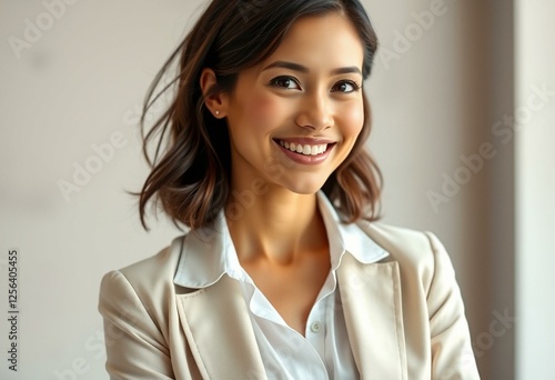 people, lighting, detail, photorealistic, teacher, mood, photo, smile, warm, calm, blouse, high, blazer, subtile, female, hip, soft, professional, hand, depth, shallow, human, white, tailored, background, education, pose, field, crisp, portrait, teaching, relaxed