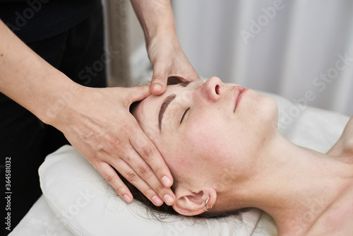 Female therapist massages the head and face of a young woman. Relaxing massage. Therapeutic massage. Alternative medicine. Spa treatments.