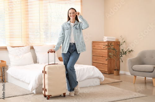 female, hotel, room, suitcase, holiday maker, abroad, adult, arrival, arrive, bag, baggage, beautiful, bed, bedchamber, booking, caucasian, checking, comfort, girl, happy, hobby, holiday, leisure, lifestyle, baggage, modern, people, person, portrait, relax, resort, rest, smiling, suite, tour, tour tourism, travel, traveler, travelling, trip, vacation, visitor, voyage, woman, young