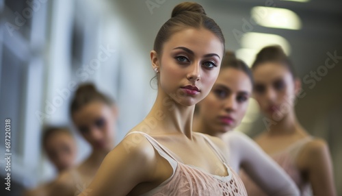 Female young girs ready for gymnastics or ballet dancing classes in pastel pink attire with focus on central person