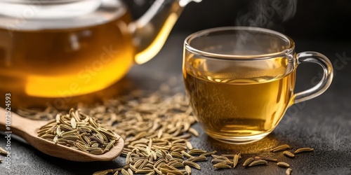 fennel, seed, tea, cup, glasses, steaming, hot, beverage, drink, herbal, infusion, aromatic, favor, spice, healthy, natural, organic, kitchen, table, surface, dark, brown, wooden, spoon, liquid, clear, transparent, warm, delicious, comforting, fresh, macro, photo, food, background, texture, still life