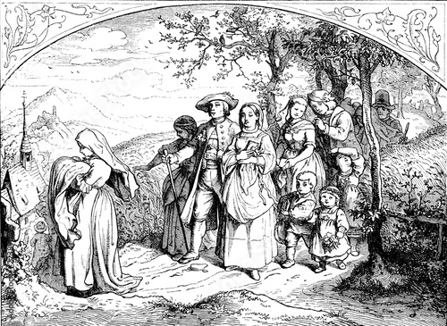 festive, baptism, country, procession, people, children, mother, family, rural, countryside, landscape, mountain, religion, faith, belief, tradition, costume, holiday, church, traditional, celebration, culture, ceremony, event, devotion, spiritual, worship, artistic, artwork, illustration, black-and-white, drawing, history, historical, heritage, engraved, engraving, etched, antique, retro, document, revival, vintage, illustrated, old-fashioned, woodcut, past