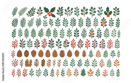 Festive botanical elements collection: holiday greenery with pine, holly, and berries