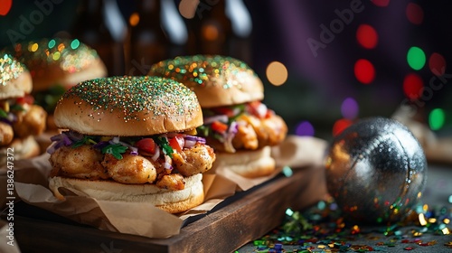 Festive chicken burgers with colorful sprinkles on buns, served on wooden tray.