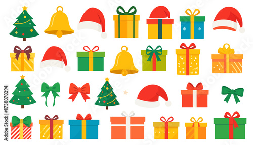 Festive Christmas decorations: trees, bells, gifts, and Santa hats.