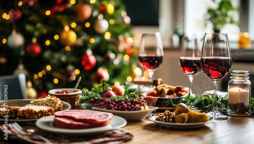 Festive Christmas dinner scene with appetizers, wine, and a decorated tree
