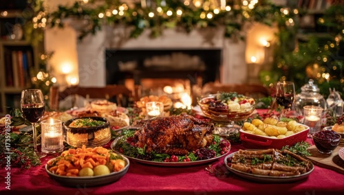 christmas, dinner, table, holiday, festive, ham, roasted, food, meal, celebration, decoration, ornament, light, garland, fireplace, family, gathering, tradition, winter, season, dish, plate, glassware, candle, warm, inviting, atmosphere, home, house, interior, design, style, arrangement, setting, event, occasion, party, feast, delicious, cookery, epicure, luxury, elegant, rich, abundance, still life, indoor, tableware, presentation