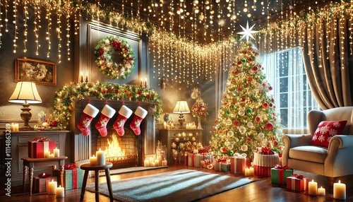 christmas, living room, fireplace, christmas tree, present, gift, decoration, holiday, festive, cosy, winter, home, interior, light, candle, stocking, chaplet, ornament, warm, magical, family, celebration, comfort, joy, happiness, season, sparkle, illuminated, ambience, room