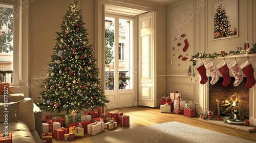 Festive Christmas Living Room with Decorated Tree and Presents
