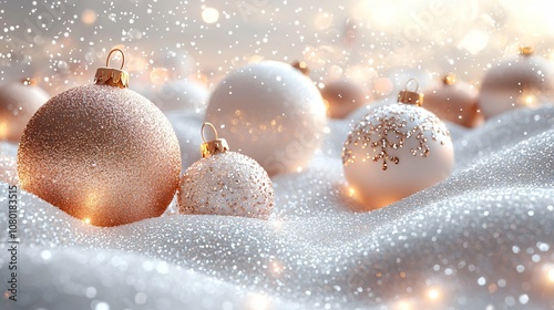 Festive Christmas ornaments on a soft white surface, glistening in warm hues, perfect for holiday-themed designs, cards, or winter celebrations.