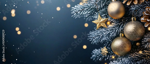 Festive Christmas Tree Branch with Gold Ornaments and Snow