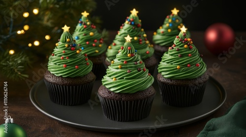 cupcake, dessert, holiday, celebration, chocolate, baking, green, frosting, decoration, festive, sweet, party, treat, culinary, tasty, seasonal, christmas, food, pastry, sugar, bright, star, decor, joyful, display, gift, epicure, joy, home, fun, cheer, delicious, homemade, vibrant, table, plate, traditional, indulgence, winter, event, gathering
