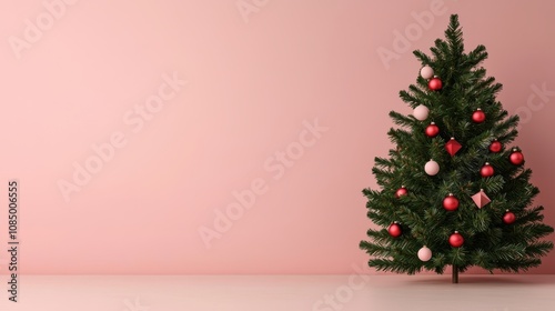 Festive Christmas Tree Decorated with Colorful Ornaments Against a Soft Pink Background Perfect for Holiday Celebrations and Seasonal Promotions in Home Decor