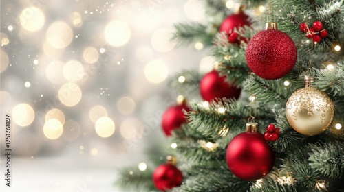 Festive Christmas Tree Decorated with Red and Gold Baubles Against Bokeh Lights Background
