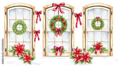 Festive Christmas Windows Wreaths Poinsettias Snow Holiday Decor Winter Scene