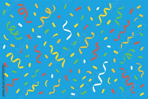 Festive colorful confetti and streamers on vibrant blue background for party celebration design