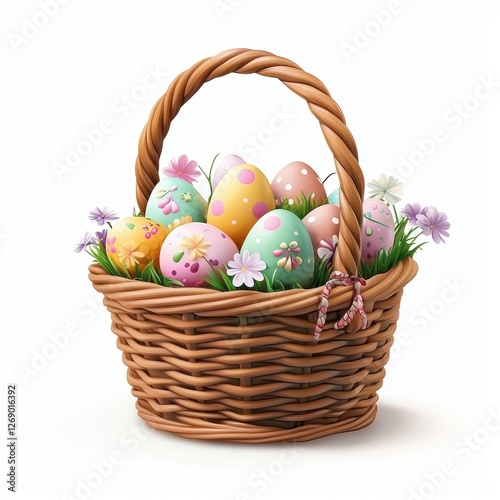 Festive Easter basket filled with pastel-colored eggs, flowers, and candies, isolated on white