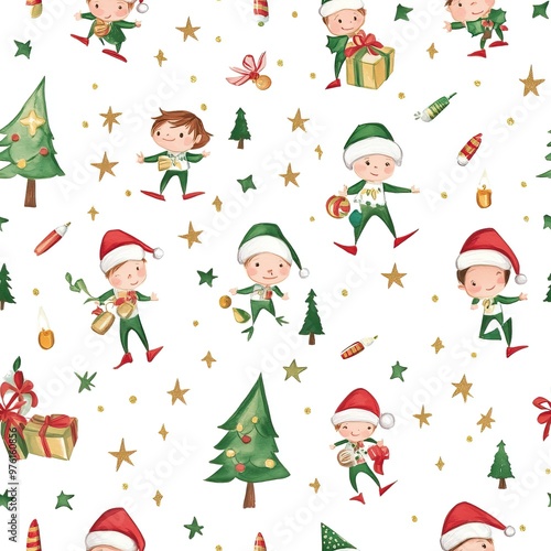 Festive Elves and Christmas Trees. Gift wrapping paper pattern. AI generated image