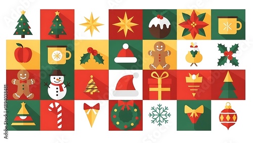 christmas, holiday, festive, ornament, symbol, design, illustration, flat, grid, present, snowflake, bow, tree, star, holly, apple, cake, snowflake, gingerbread, snowman, santa, candy, chaplet, light, cheerful, celebration, seasonal, gift, joy, fun, decoration, winter, year, season, pattern, background, abstract, graphic, square, red, green, yellow, white, colours, style, simple, vector, layout, art