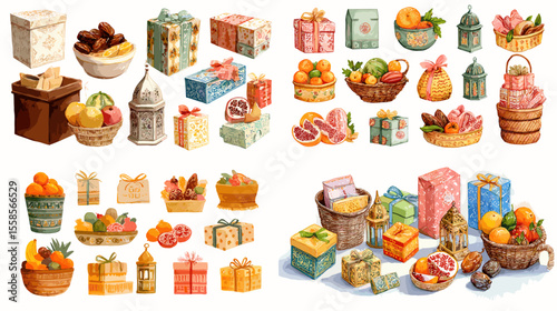 gift, ramadan, basket, fruit, date, present, box, lantern, food, eid, parcel, sweet, festive, celebration, orange, apple, dried, tropical, islamic, lantern, holiday, generosity, sugar, container, arrangement, decoration, ribbon, hamper, giving, arabic, nut, dessert, fig, bag, feast, blessing, party, citrous, tradition, culture, goodie, wrapped, melon, treat, delicious, oriental