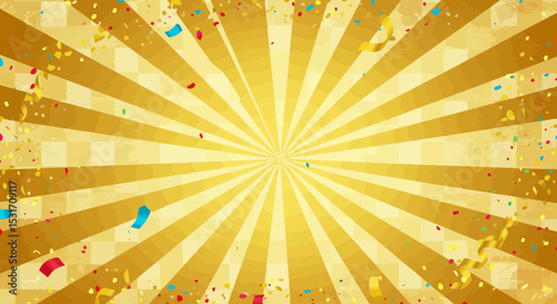 Festive golden burst background with confetti and traditional Japanese pattern