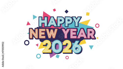 Festive "Happy New Year 2026" text design with colorful abstract geometric shapes and confetti, celebrating the upcoming year with a vibrant and joyful graphic.