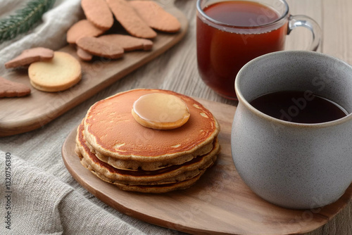 Festive holiday gingerbread pancake breakfast on wood table with tea and cookies