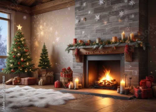 Festive holiday scene with decorated fireplace and snowflakes falling from sky, crackling flames, christmas