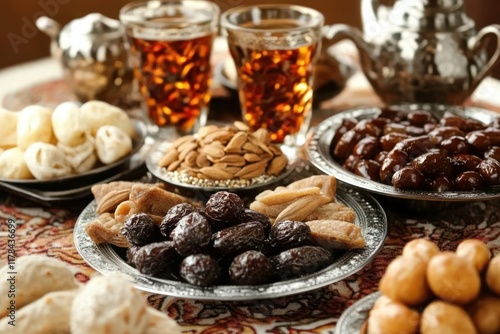 Festive Middle Eastern sweets, tea, and nuts on table