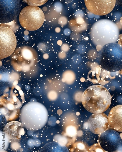 blue, gold, white, sphere, ball, ornament, christmas, winter, festive, holiday, celebration, sparkle, glistering, light, bokeh, snow, falling, background, design, abstract, texture, pattern, shiny, glossy, elegant, luxurious, magical, dreamy, bright, shimmer, gleam, decorative, seasonal, joyful, merry, happy, party, event, image, graphic, illustration, vibrant, beautiful, stunning, stylish, luxury