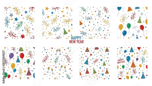 Festive New Year's Eve Seamless Patterns Collection with Confetti and Celebration Icons