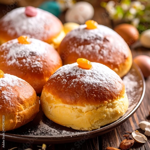 pastry, easter, baked, delicious, sweet, yeast, bun, round, yellow, sugar, gold, food, festive, holiday, tradition, treat, dessert, colourful, closeup, plate