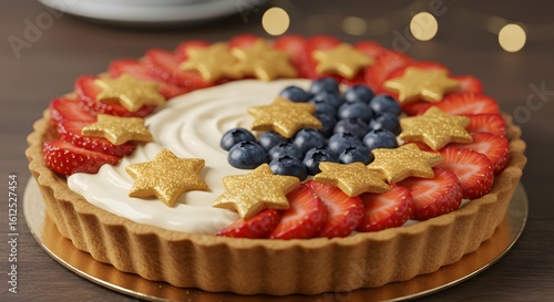 Festive Patriotic Tart: A vibrant, gourmet tart adorned with fresh strawberries, blueberries, and star-shaped decorations, creating a patriotic dessert perfect for any celebration.