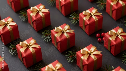 Festive Red Gift Boxes with Gold Ribbons and Evergreen Branches on a Dark Background