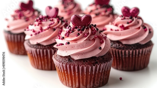Festive Valentine's Day Cupcakes with Heart Decorations on White Background