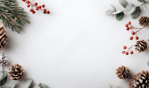 christmas, winter, festive, arrangement, sprig, berry, pine, cone, greenery, eucalyptus, decoration, white, background, design, pattern, composition, frame, holiday, nature, natural, element, red, green, brown, light, simple, textured, modern, minimalist, stylish, subtile, flat, top, view, decoration, detail, compositional, ornament, celebration, adornment
