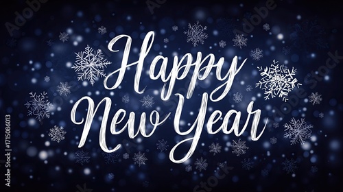 Festive winter background featuring elegant typography with the phrase Happy New Year, surrounded by snowflakes and a sparkling bokeh effect, creating a celebratory atmosphere