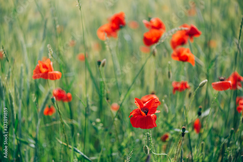 Field of bright red poppy flowers. Summer time. Background with copy space. Blooming poppies garden. Colorful meadow