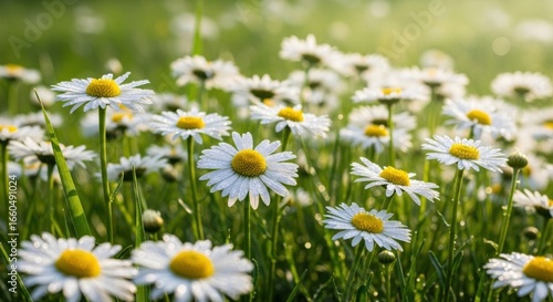 Field of delicate white daisy flowers blooming in soft sunlight gentle nature scene