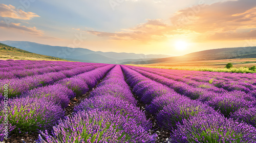 field, lavandula, green, grass, stretching, toward, gold, sunrise, distance