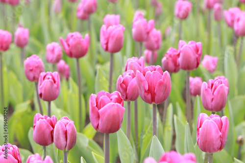 Field with pink tulips. Tulip buds with selective focus. Natural landscape with spring flowers. World Tulip Day