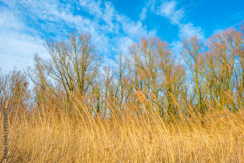 Field with reed, bushes and trees in wetland under a blue cloudy sky in sunlight in winter, Almere, Flevoland, The Netherlands, February 21, 2021