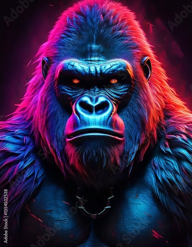 gorilla, monkey, epic, animal, warrior, neon, style, dark, background, futuristic, glowing, beast, battle, powerful, fierce, heroic, energy, intense, dramatic, cyber, electrifying, bold, striking, fighter, fantasy, illuminated, legendary, vibrant, mystical, strong, predator, science fiction, mythic, digital, fire, dynamic, shadowy, forceful, brute, aggressive, mysterious