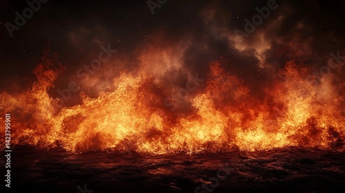 fire, flames, inferno, burning, heat, orange, yellow, red, smoke, darkness, destruction, chaos, devastation, consuming, blaze, ember, ash, apocalyptic, disaster, ruin, night, sky, cloud, dramatic, powerful, intense, raging, wildfire, landscape, earth, ground, horizon, gloom, nightmarish, immersed, hot, smoldering, fiery, scorching