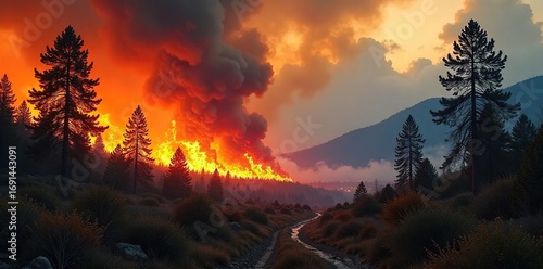 Fierce wildfire raging through a dry forest, consuming trees and underbrush, creating a dramatic landscape of smoke and flames , fire, flames, fire fighting