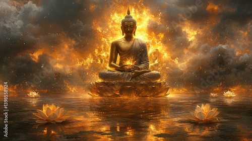 buddha, fire, flames, lotus, water, meditation, serenity, spiritual, nirvana, peace, calm, calmness, religious, gold, statue, art, digital, artwork, illustration, fantasy, mystic, divine, heavenly, sacred, powerful, majesty, wisdom, compassion, nirvana, burning, glowing, image, picture, photo, visual, graphic, design
