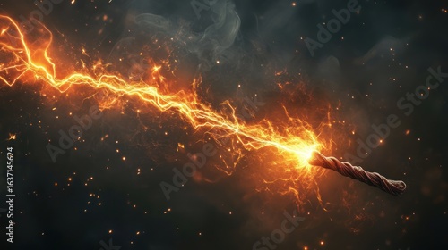 Fiery energy wand, dark background, sparks, smoke